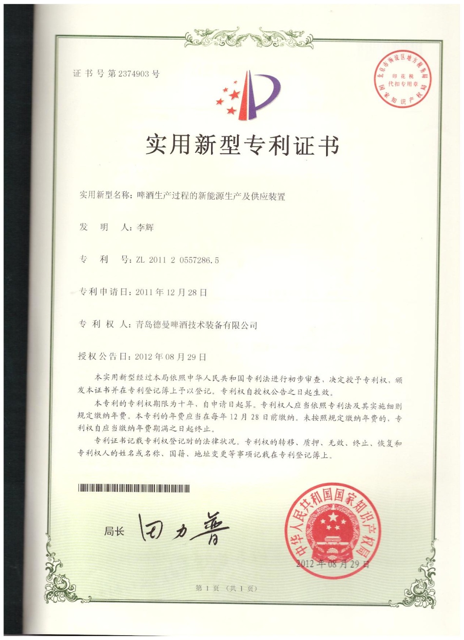 The new energy production plan supply device in the beer production process is the new patent technology used by Qingdao Deemann. It uses the biomass fuel boiler as the heat source, with the aid of the absorption refrigeration technology using steam refrigeration, and the coordinated design of the whole plant energy to realize the coordination configuration of the cold heat source in the beer factory, and greatly save the beer factory. Energy consumption. The project was successfully applied to the brewing process of Qingdao Deemann beer workshop in 2012 and achieved remarkable energy saving effect.